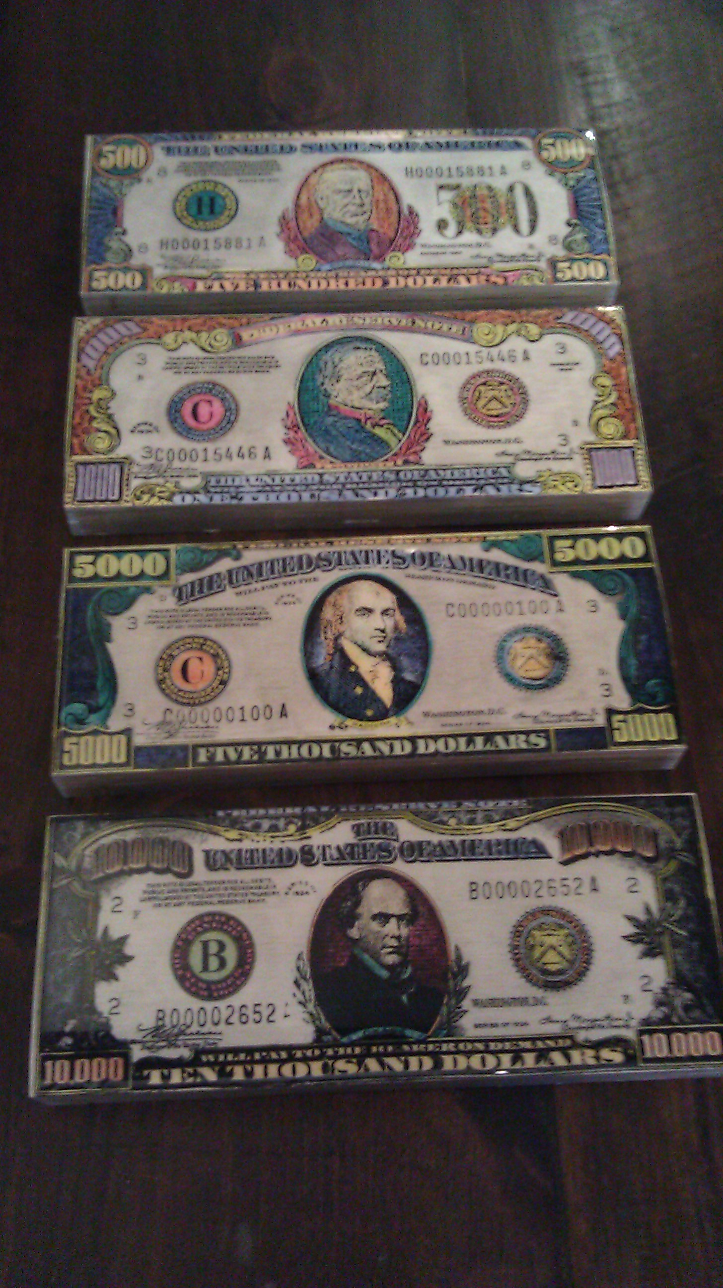 The Federal Reserve began taking high-denomination bills out of circulation in 1969. As of May 30, 2009, there were only 336 known $10,000 bills in circulation; 342 remaining $5,000 bills; and 165,372 remaining $1,000 bills. Due to their rarity, collectors will pay considerably more than the face value of the bills to acquire them.